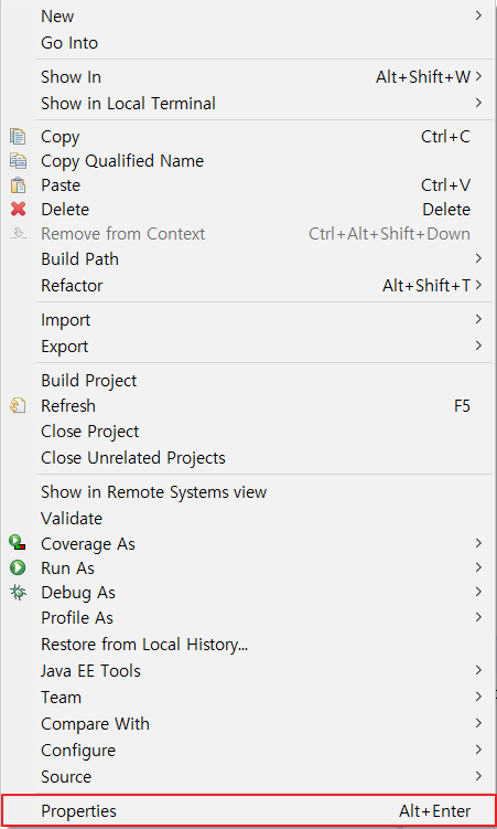1. 프로젝트 우클릭후 [Properties] 클릭