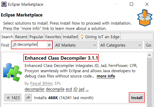 2. "decompiler" 라고 검색하여 [Enhanced Class Decompiler] 를 설치합니다.