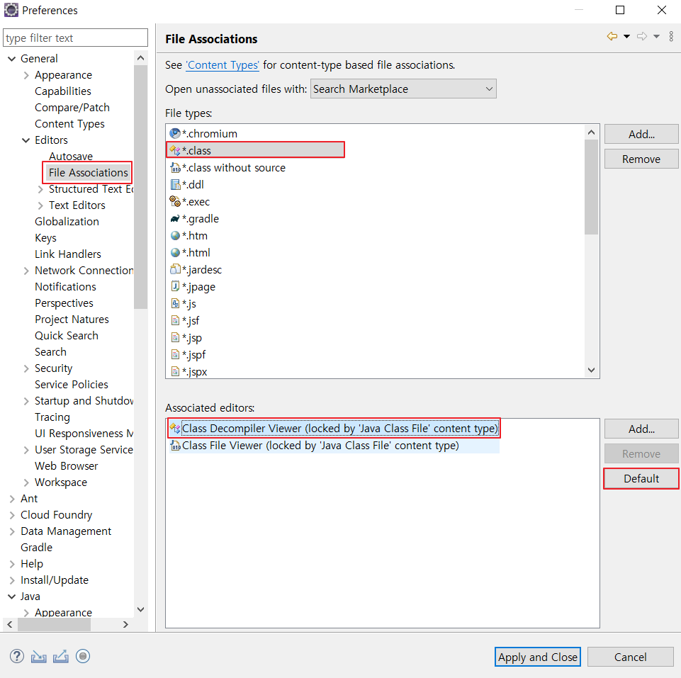 *.class, *.class without source 타입의 기본 Viewer를 변경해줘야 합니다.
