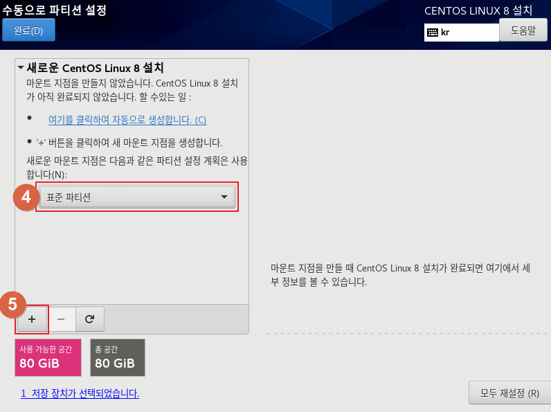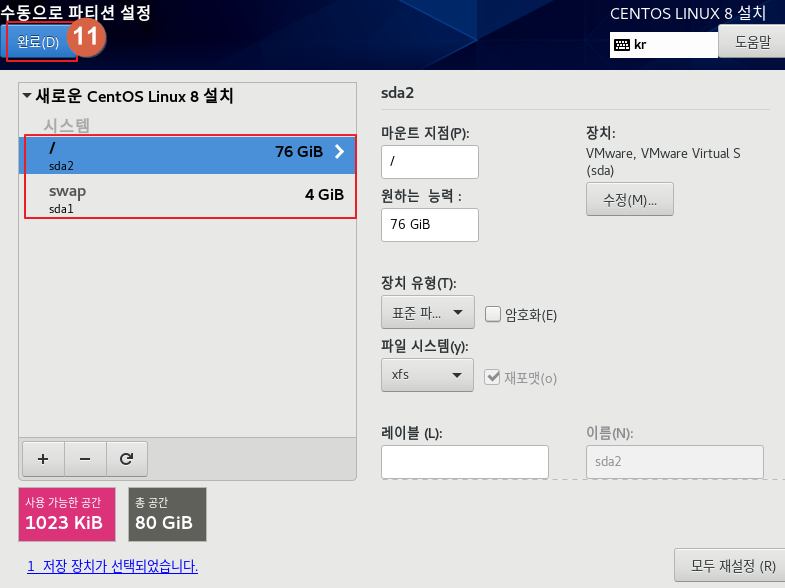 7. [설치 목적지] 로 들어가서 2개의 파티션을 만들어줍니다.