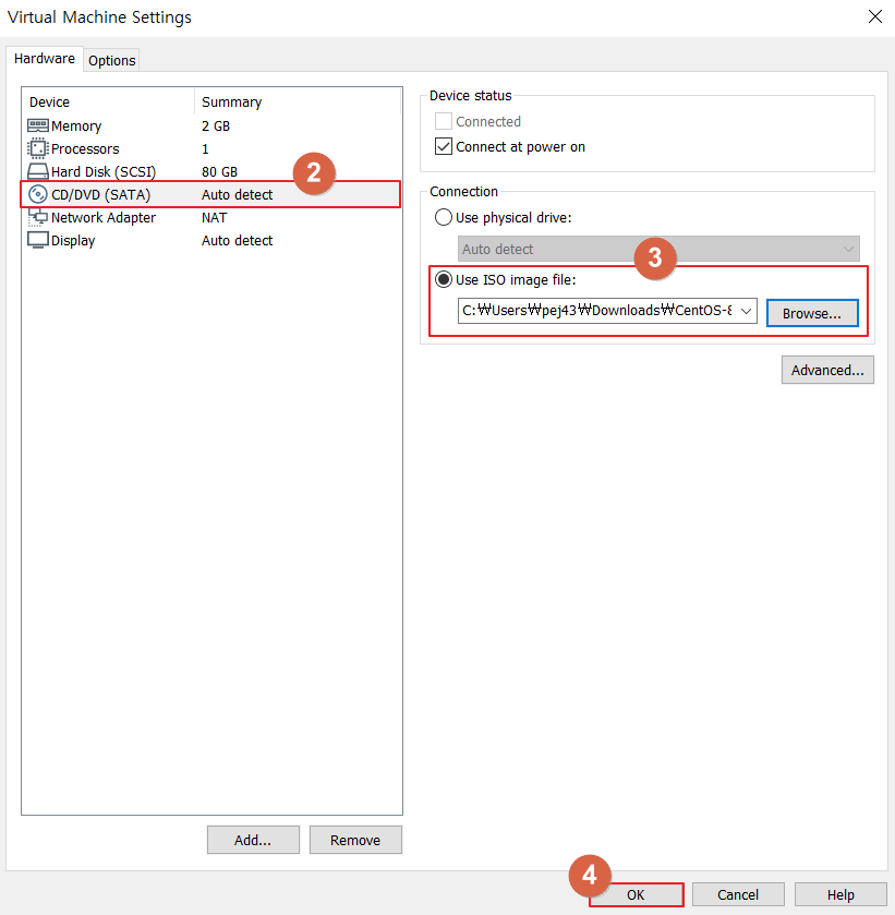 이전 포스팅에 만든 가상 머신에 이제 CentOS 8을 설치하겠습니다.