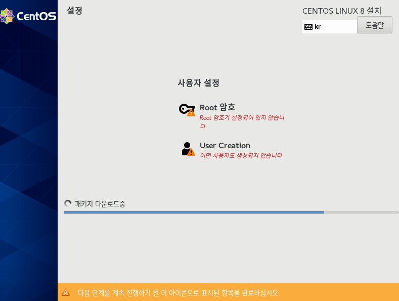 8. 설치가 진행되는 동안 root계정 암호와 사용자 계정을 만들어주시면 됩니다.