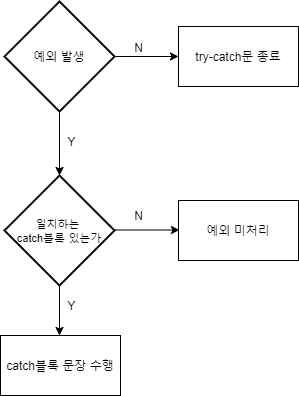 catch문을 차례대로 내려가면서 instanceof 연산자를 이용하여 발생한 예외와 일치하는 블록인지 확인하며 일치하는 것이 없을 경우 그 예외는 처리되지 못함
